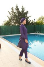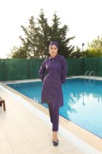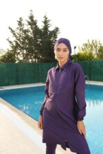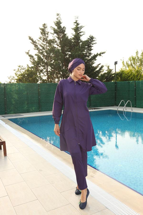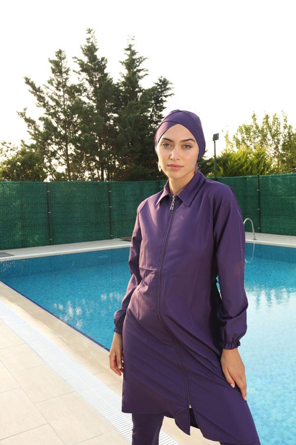 Fermuarlı Gömlek Yaka Tesettür Mayo Mor