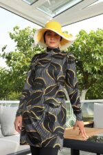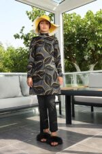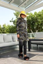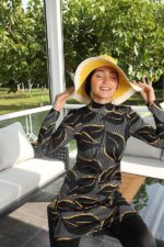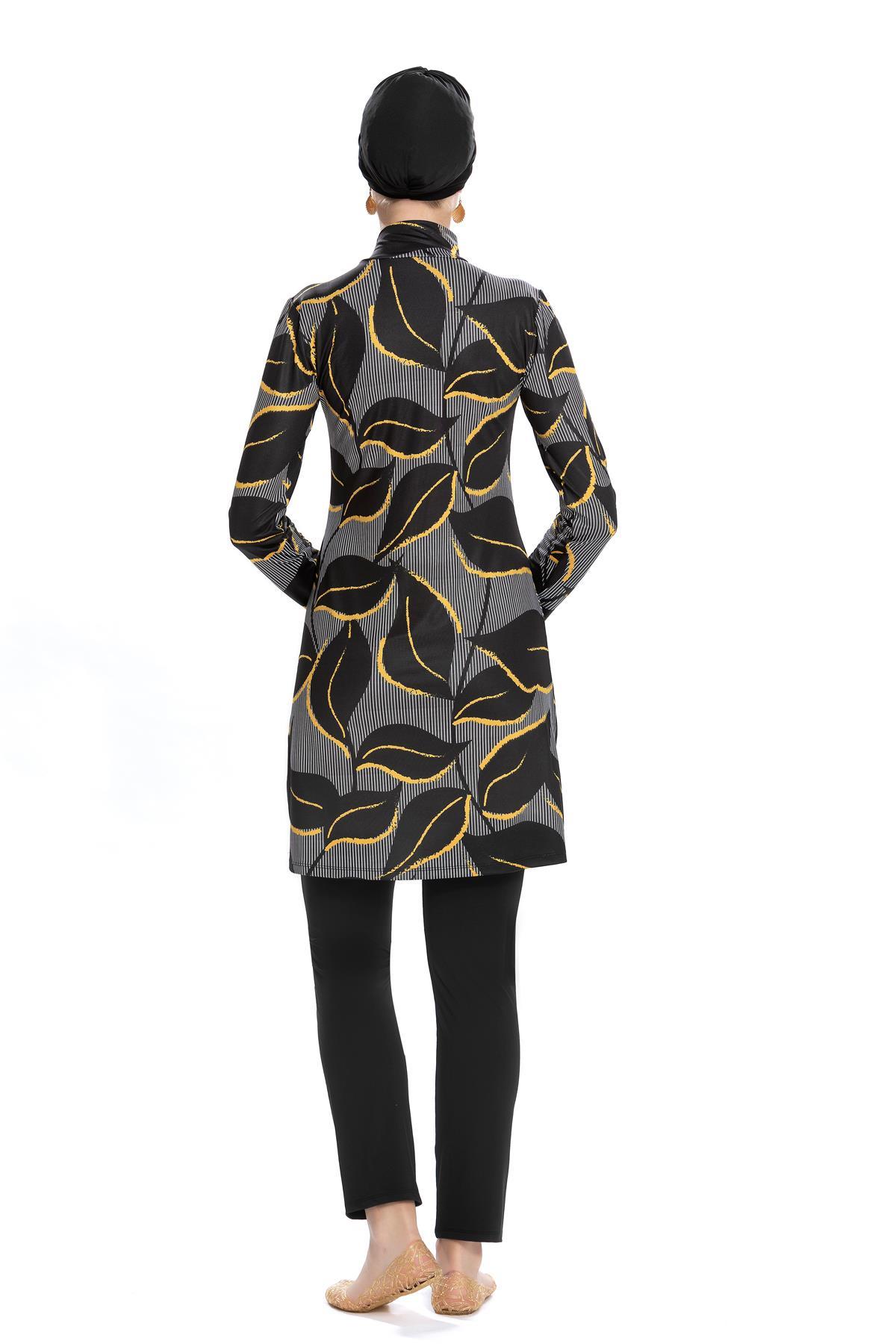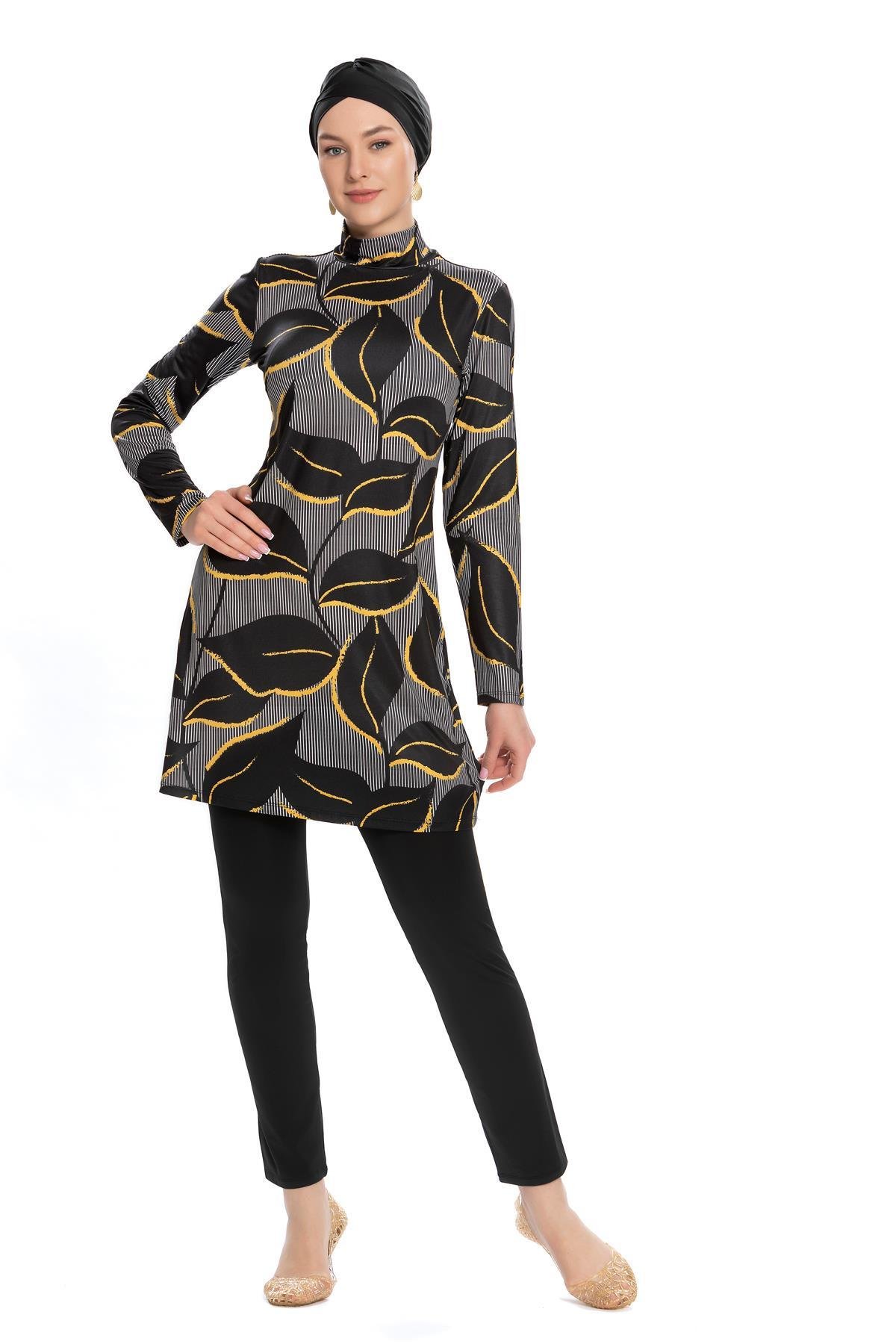 Tesettür mayo takımı pantolon kesim alt, tunik ve çapraz boneden oluşuyor. Büstiyeri ürüne dikilidir.