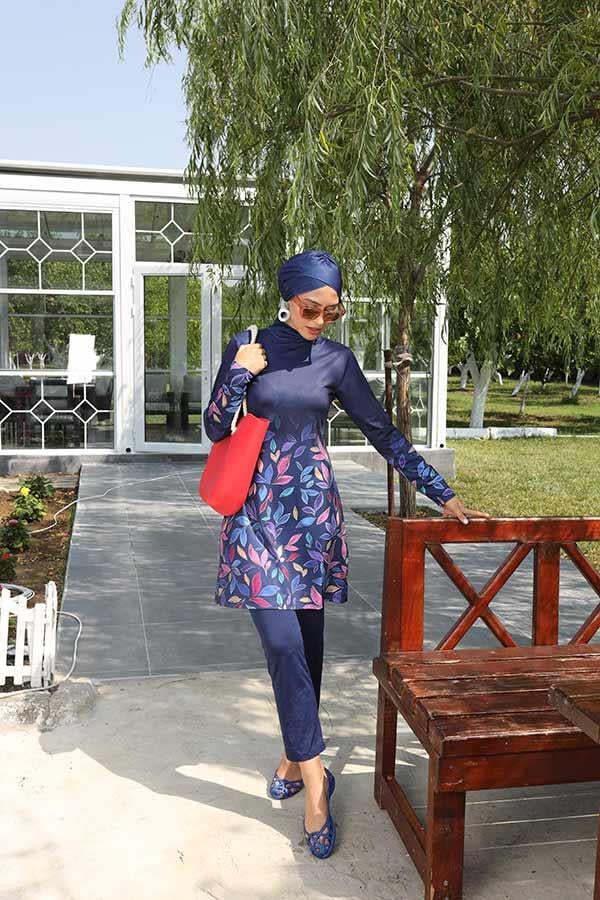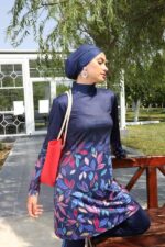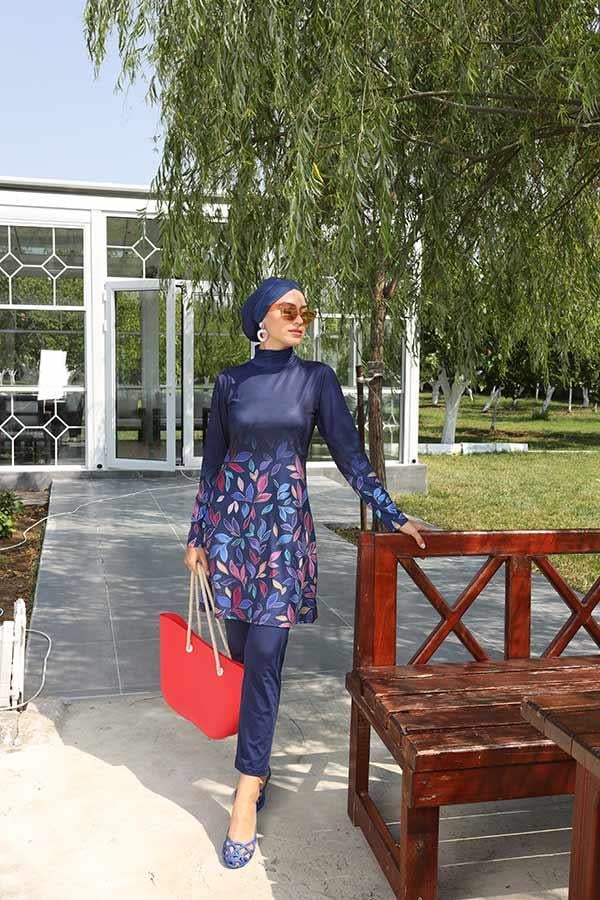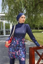Tesettür mayo takımı pantolon kesim alt, tunik ve çapraz boneden oluşuyor. Büstiyeri ürüne dikilidir.
